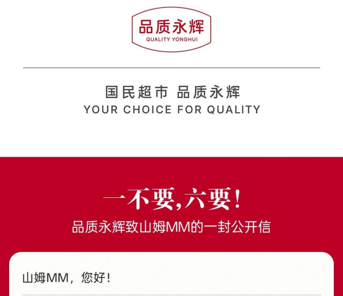 3月16日,永辉超市自有品牌“品质永辉”发布致山姆MM的一封公开信,提出“一不要,六要”。