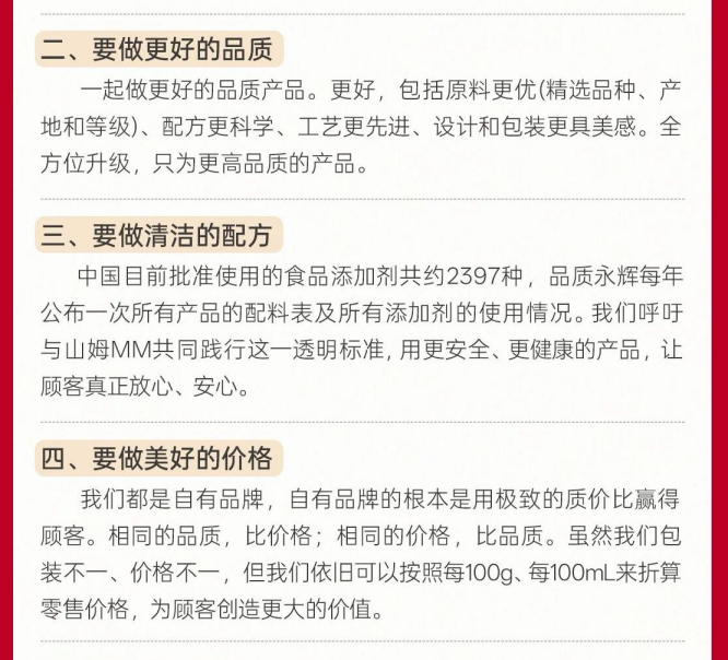 信中还呼吁秉持“六要”推动行业发展,即“要做更好的品质、要做清洁的配方、要做美好的价格、要成就员工、要推动ESG、要持续创新”。
