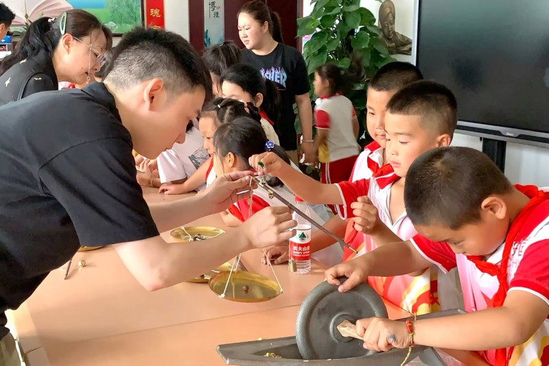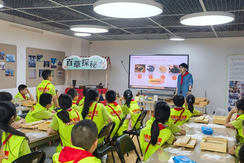 在同仁堂中医药文化历史展区,一组组制药器具模型再现传统中药制药技艺;学生们通过亲自称药、碾药、搓药丸等互动体验,实现了与中草药的亲密接触。结合端午节气特征和季节特点,同仁堂的老师带领同学们亲手制作艾草锤和中药香囊,了解相关中草药知识。