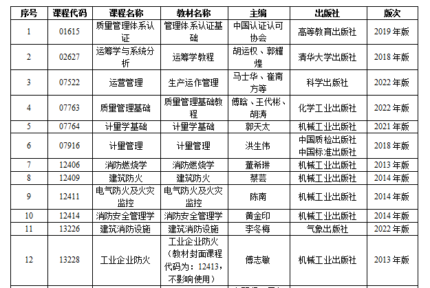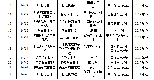 质量管理与认证(专科):质量管理基础、标准化基础、质量管理体系认证、质量管理体系认证、计量学基础、运营管理、服务质量管理与认证基础、质量管理工具应用概论、标准编写实务、质量改进、5S管理操作技巧与实践